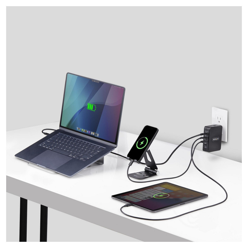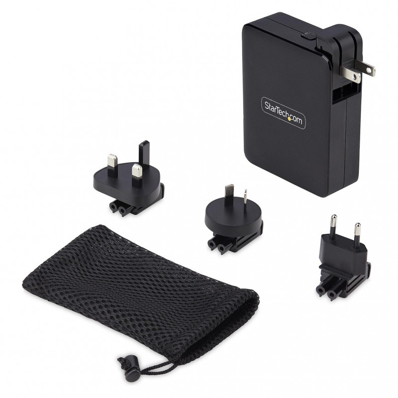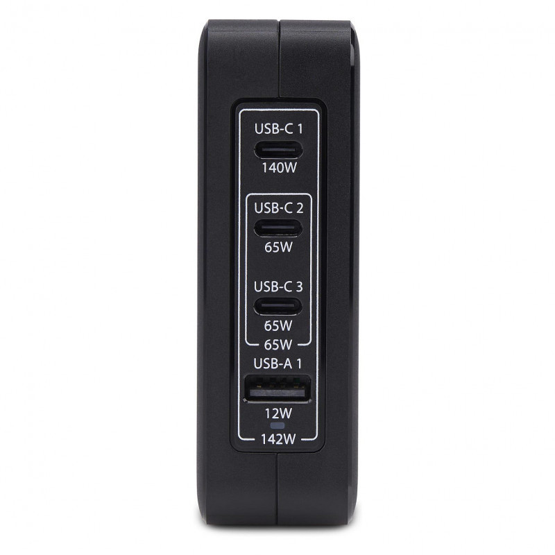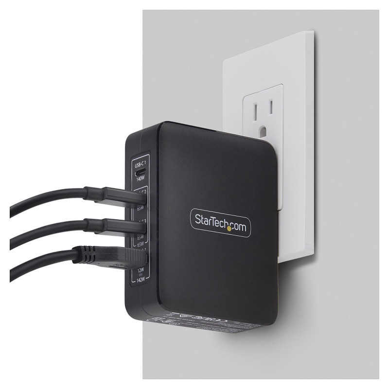 "StarTech.com 140W USB-C Wall Charger, 3x USB-C/1x USB-A, PD 3.1 International GaN Power Adapter for MacBook/Dell XPS/Inspiron. Charger type: Indoor, Power source type: AC, Charger compatibility: Universal. Input voltage: 100 - 240 V, Maximum output voltage: 28 V. USB Type-C ports quantity: 3, Fast charging, Power protection features: Over current, Over voltage, Overheating. Product colour: Black"\n"Power and charge your laptop and USB devices with this 140W Power Delivery 3.1 wall charger