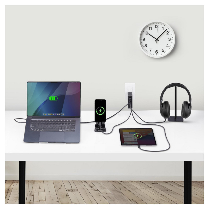 Safety and efficiency are paramount with the 140W USB GaN Charger. It is TUV Safety Listed (IEC 62368-1) and FCC/ICES EMC certified, providing protection against over-voltage, current, and temperature. The Active Power Factor Correction (PF >0.99) enhances efficiency and ensures cool operation. Additionally, it meets DOE Level VI standards, guaranteeing energy efficiency and reliable performance.