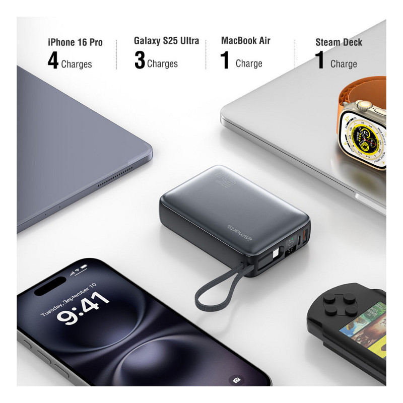 Powerful on the go and more handy than ever: The compact power bank fits easily into any pocket with its 10.3 × 7.1 × 2.9 cm - and is even smaller than an iPhone. With a capacity of 20,000 mAh, 45 W charging power and a weight of just 0.33 kg - hardly heavier than your smartphone - it provides reliable power for tablets, Nintendo Switch, Steam Deck or small laptops such as a MacBook Air. The lightweight power bank offers enough power for the whole day and, thanks to less than 100 watt hours, remains your perfect companion even when traveling by plane. Ideal for commuters, adventurers and anyone who doesn't want to do without reliable energy in everyday life.