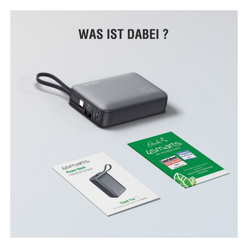 "4smarts 541409. Battery capacity: 20000 mAh, Battery technology: Lithium Polymer (LiPo), Fast charging technology: Hisilicon FCP, Power Delivery 3.0, Quick Charge 3.0. USB Type-A output ports: 1, USB Type-C ports quantity: 1. Total output power: 45 W. Product colour: Grey"\n"Charge whenever you want - without any additional cables