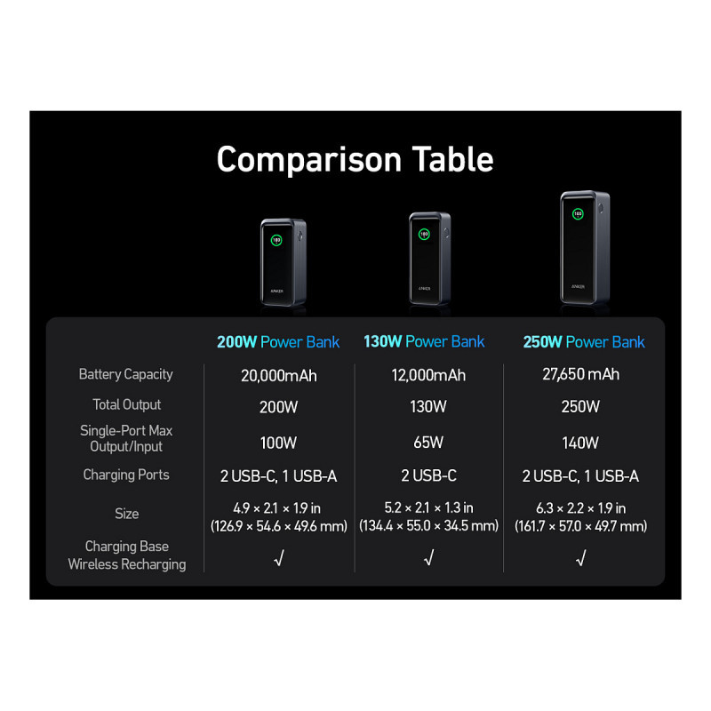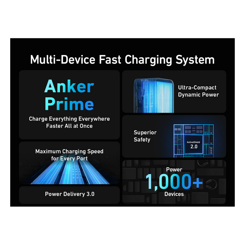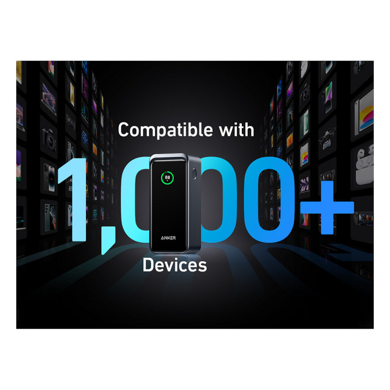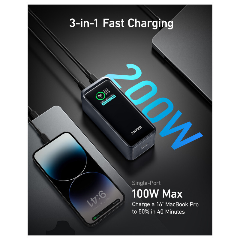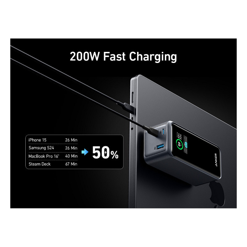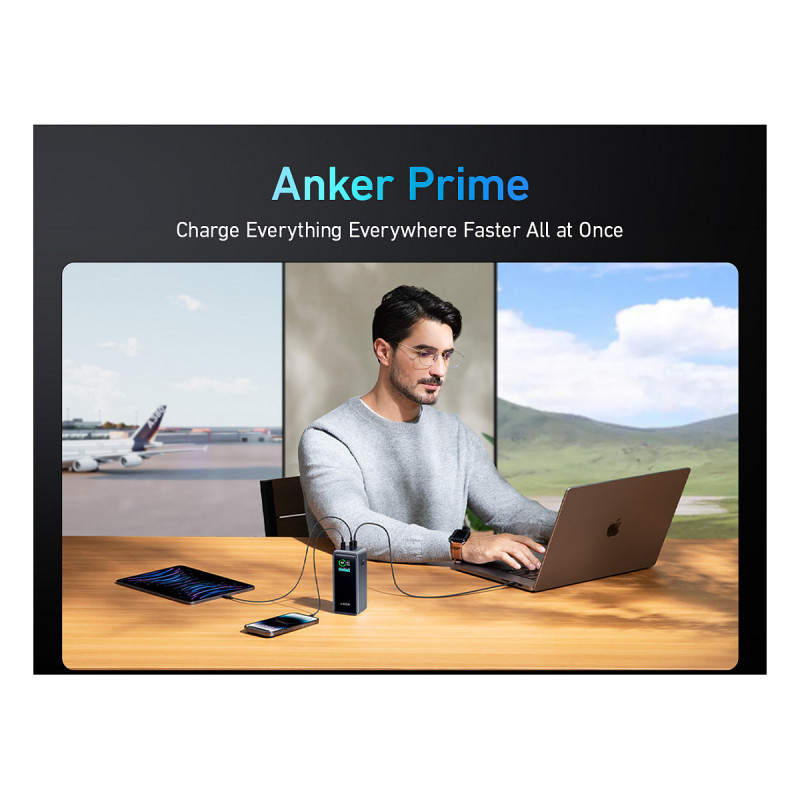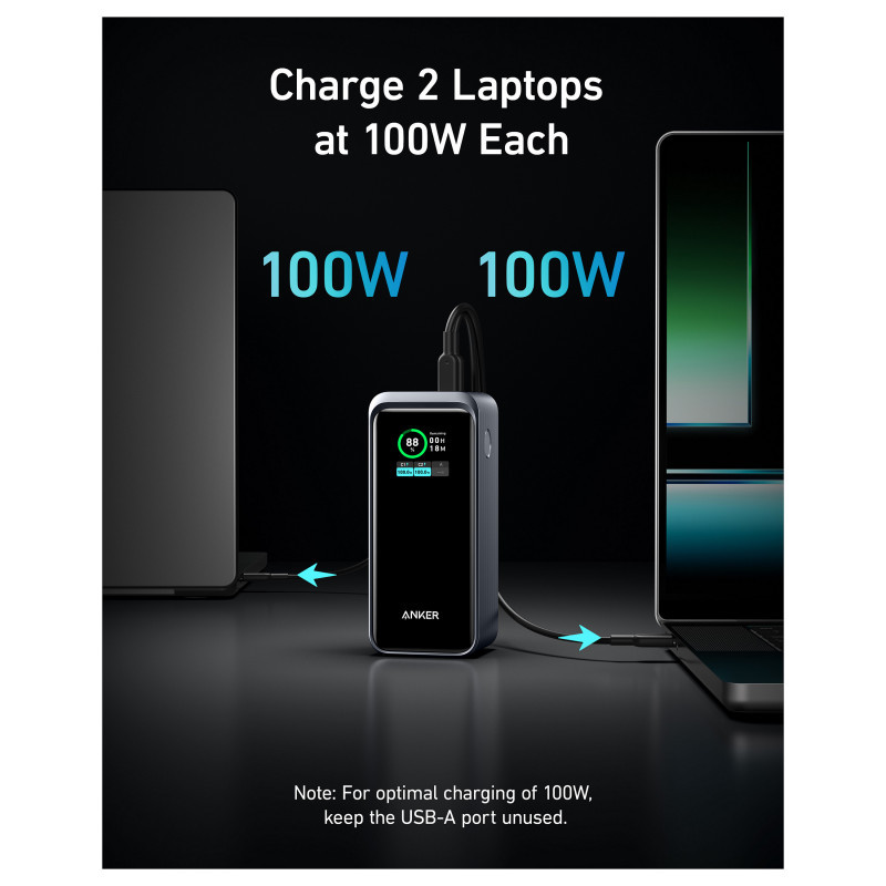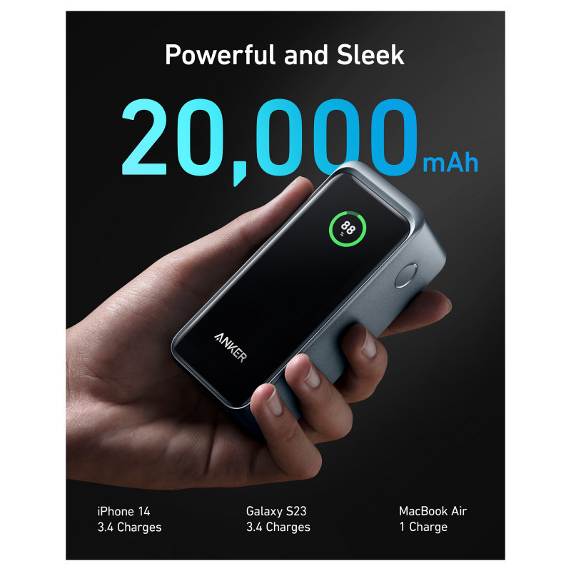 "Anker Prime. Battery capacity: 20000 mAh. USB Type-A output ports: 1, USB Type-C ports quantity: 2. Total output power: 200 W. Product colour: Black"\n"- 200W Total Output: Equipped with two high-powered USB-C ports and one USB-A port totaling 200W output, quickly charge two laptops simultaneously at 100W each for maximum efficiency.