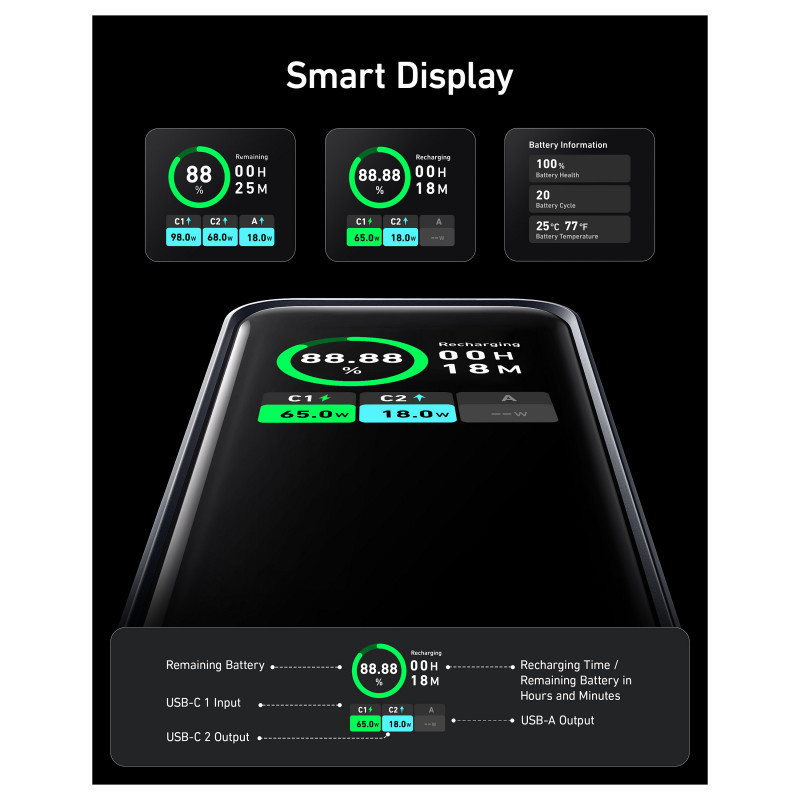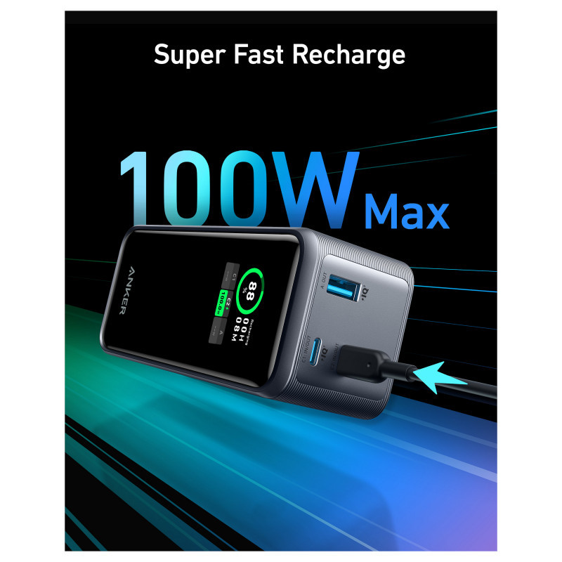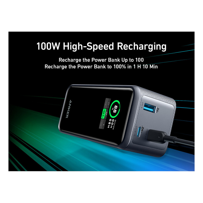 - Lightning-Fast Recharge: The 100W rapid recharge via the USB-C port enables the power bank to be fully recharged in 1 hour and 15 minutes.