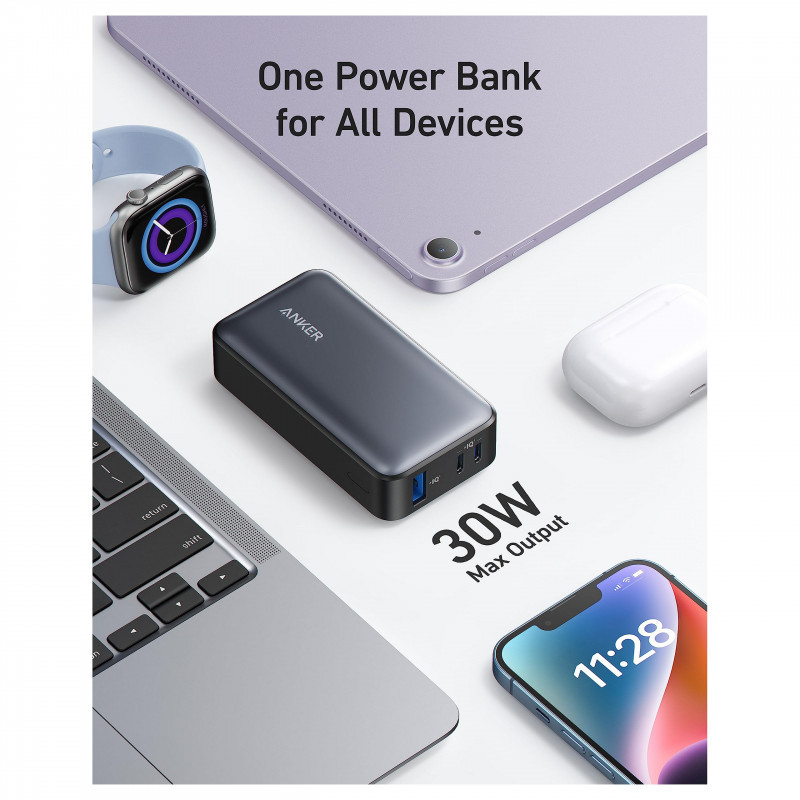 "Anker 533. Battery capacity: 10000 mAh. USB Type-A output ports: 1, USB Type-C ports quantity: 2. Product colour: Black"\n"Simultaneous Charging for 3 Devices