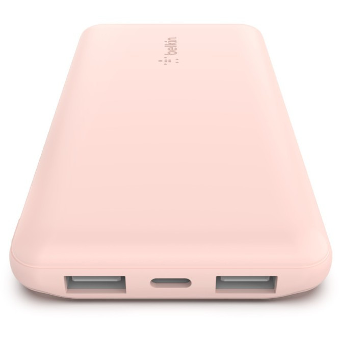 "Belkin BOOST↑CHARGE. Battery capacity: 10000 mAh. USB Type-A output ports: 2, USB Type-C ports quantity: 1. Product colour: Rose gold"\n"Charge 3 devices at once with a 10K portable charger that’s as versatile as it is convenient. Two USB-A ports and one USB-C port provide up to 15W of power at once for your smart phone and two other devices. An included USB-A to USB-C cable lets you start charging right away.