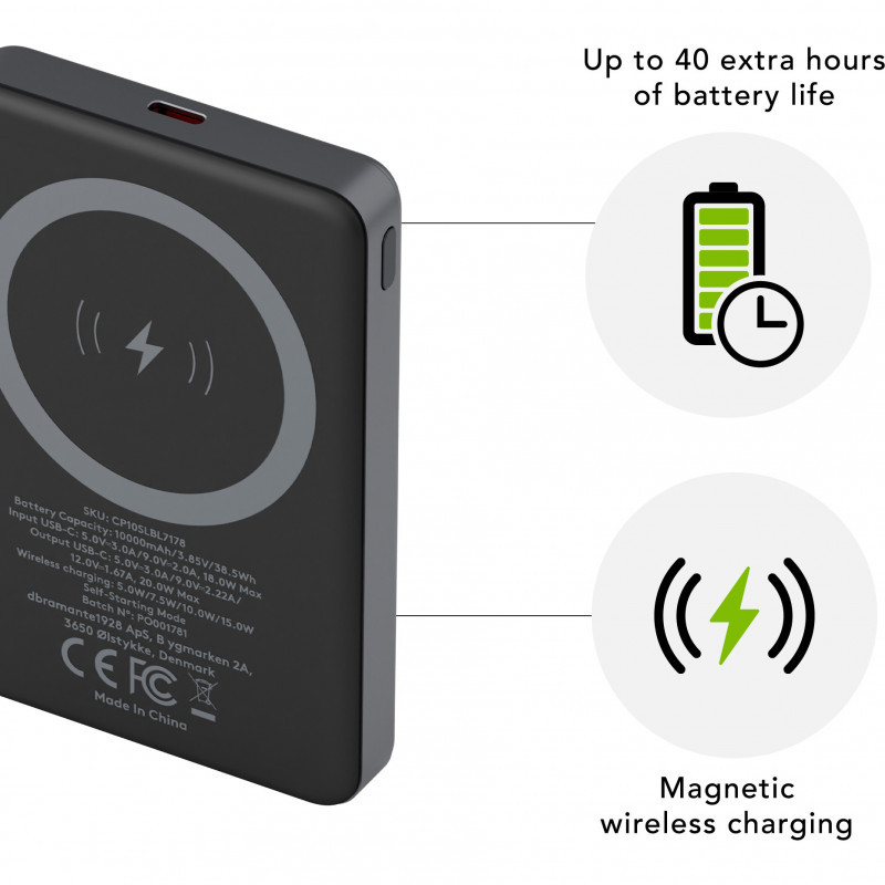 "dbramante1928 re-charge - Power Bank 10K Wireless LED - Grey. Battery capacity: 10000 mAh, Battery voltage: 3.85 V, Wireless charging. Product colour: Grey"\n"RECYCLE YOUR OLD ELECTRONICS
