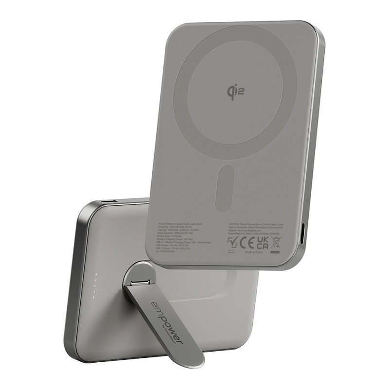 "PanzerGlass empower™ by ® empower™ Bank w. Spin Stand | 5000mAh | Titanium. Battery capacity: 5000 mAh. USB Type-C ports quantity: 1. Wireless charging. Product colour: Titanium"\n"FAST CHARGE