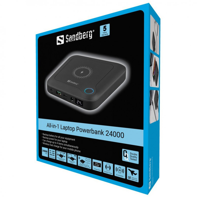 "Sandberg All-in1 Laptop Powerbank 24000. Battery capacity: 24000 mAh, Fast charging technology: Quick Charge 2.0. USB Type-A output ports: 1, USB Type-C ports quantity: 2. Wireless charging. Output current: 3 A. Product colour: Black"\n"The Sandberg All-in-1 Laptop Powerbank 24000 is your universal energy source on the go for all your mobile equipment, even your laptop or Macbook. With its powerful 24000 mAh battery, there is enough power for several chargings of a smartphone or several hours of extra work on the laptop. The powerbank is simple to recharge with the included AC adapter or from any USB-C charger for a few hours. With the DC outlet and 12 different adapters in the pack, as well as a Quickcharge USB port and two USB-C ports, many different pieces of equipment can be charged at maximum speed. As an added feature, there is even a built-in wireless fast charger on top of the powerbank. The powerbank is easy to bring along in your bag and weighs only 0.5 kg."