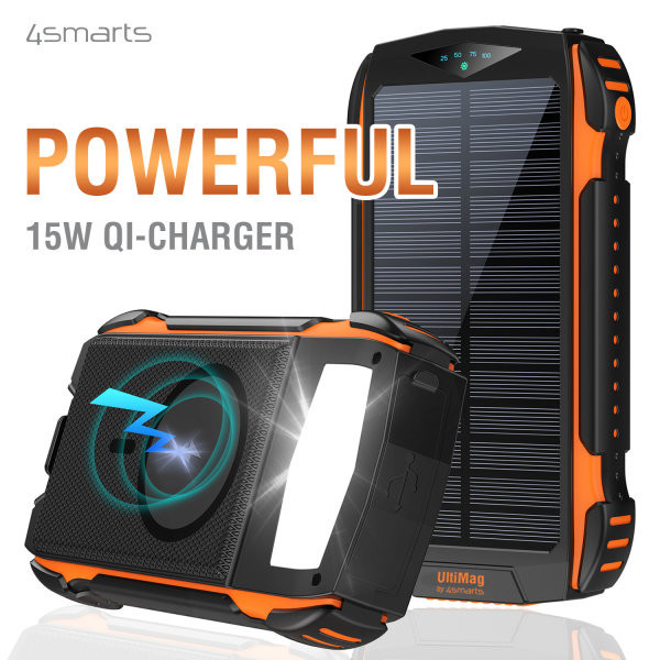 Solar Power Bank Rugged TitanPack UltiMag 20000mAh – tvirta, patikima ir universali išorinė baterija su didelės talpos akumuliatoriumi. Palaiko greitą įkrovimą per USB-C ir USB-A, turi belaidžio Qi įkrovimo funkciją bei saulės energijos panelę LED apšvietimui. Atspari vandeniui, smūgiams, dulkėms ir purvui, todėl puikiai tinka kelionėms bei aktyviam gyvenimo būdui. Komplekte yra magnetiniai UltiMag tvirtinimo žiedai, užtikrinantys patogų įrenginio tvirtinimą.
