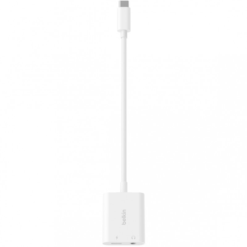 "Belkin NPA004BTWH. Host interface: USB Type-C, Hub interfaces: 3.5mm, USB Type-C. Product colour: White, USB Power Delivery up to: 60 W, Cable type: Round cable. Power plug type: Type C. Width: 33 mm, Depth: 196 mm, Height: 10 mm. Quantity per pack: 1 pc(s)"\n"Listen to music and take calls while getting up to 60W of passthrough power. Keep an open USB-C port with single-port devices to enjoy uninterrupted function while maintaining the fast charging capabilities of your device.
