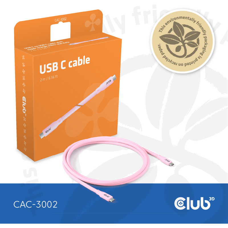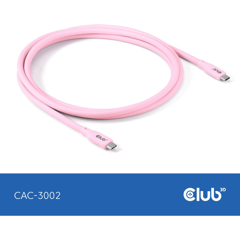 "CLUB3D USB C cable pink. Cable length: 2 m. Connector 1: USB C, Connector 2: USB C, USB version: USB4 Gen 2x2, Maximum data transfer rate: 20 Gbit/s, Product colour: Pink"\n"Introducing the Universal High-Performance USB4 Type-C Cable, our CAC-3002 Pink, crafted with your mobile phone in mind. Experience seamless connectivity and fast charging in a sleek and stylish design tailored just for you. Stay effortlessly connected with this must-have accessory for your smartphone with our versatile cable designed to support both iPhones and Android devices. With lightning-fast data transfers of up to 20Gbps over a generous length of 2 meters (6.56 feet), this cable ensures seamless connectivity for your devices. Enjoy crystal-clear video quality up to 4K at 60Hz, and experience the convenience of Power Delivery up to 240Watt (48V/5A), making charging a breeze. Designed with your needs in mind, this cable also offers support for Apple Fast Charge, ensuring your iPhone charges quickly and efficiently. Plus, add a touch of personal style to your tech with our range of available colors. Stay connected, stay stylish with our high-performance, multi-functional cable. "