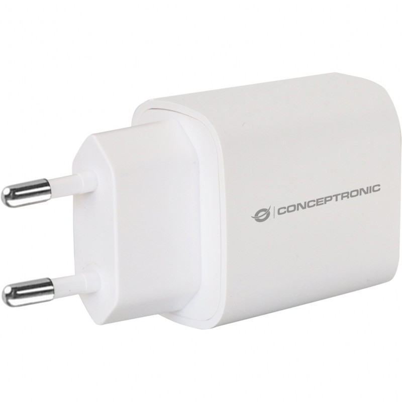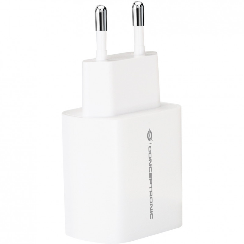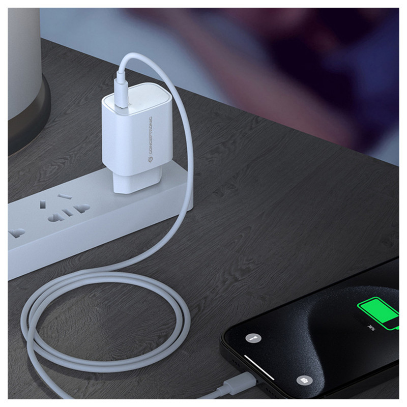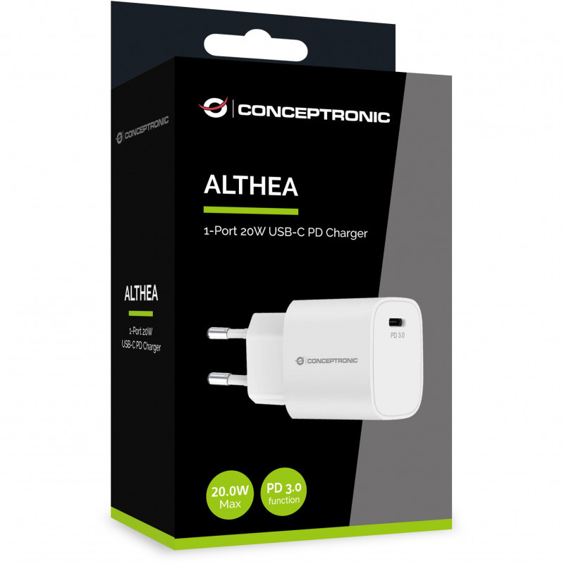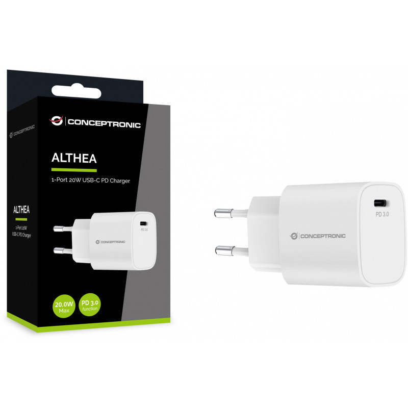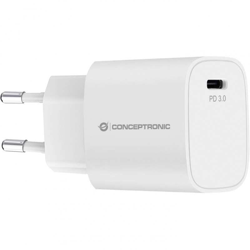 "Conceptronic 1-Port 20W USB-C PD Charger. Charger type: Indoor, Power source type: AC, Charger compatibility: Universal. Input voltage: 100 - 240 V, Maximum output voltage: 12 V. USB Type-C ports quantity: 1, Fast charging. Product colour: White"\n"