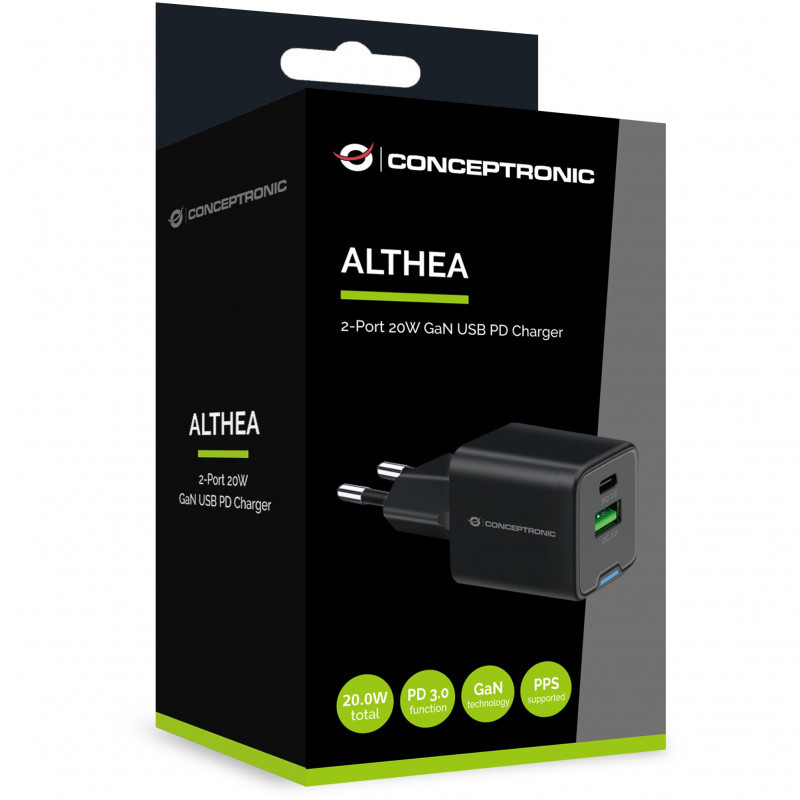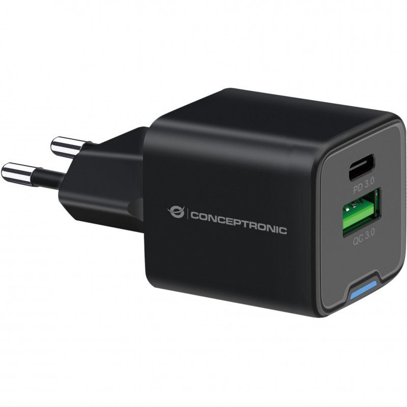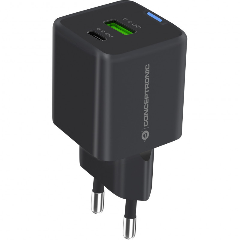 "Conceptronic 2-Port 20W GaN USB PD Charger, USB-C x 1, USB-A x 1, QC 3.0, PPS. Charger type: Indoor, Power source type: AC, Charger compatibility: Universal. Input voltage: 100 - 240 V, Maximum output voltage: 12 V. USB Type-C ports quantity: 1, Fast charging, Power protection features: Overheating, Overload, Short circuit. Product colour: Black"\n"