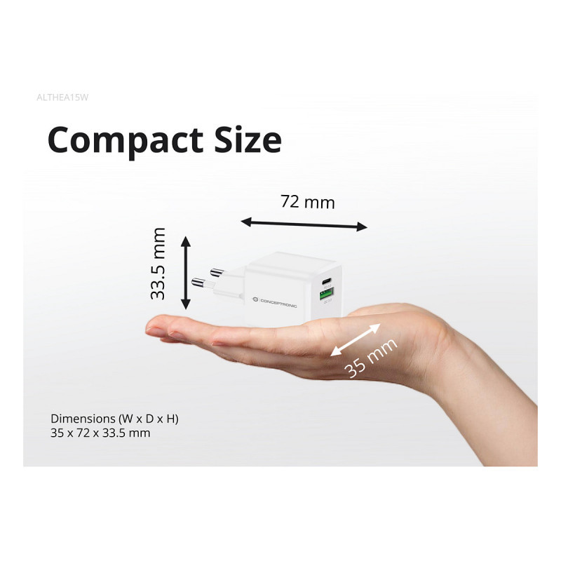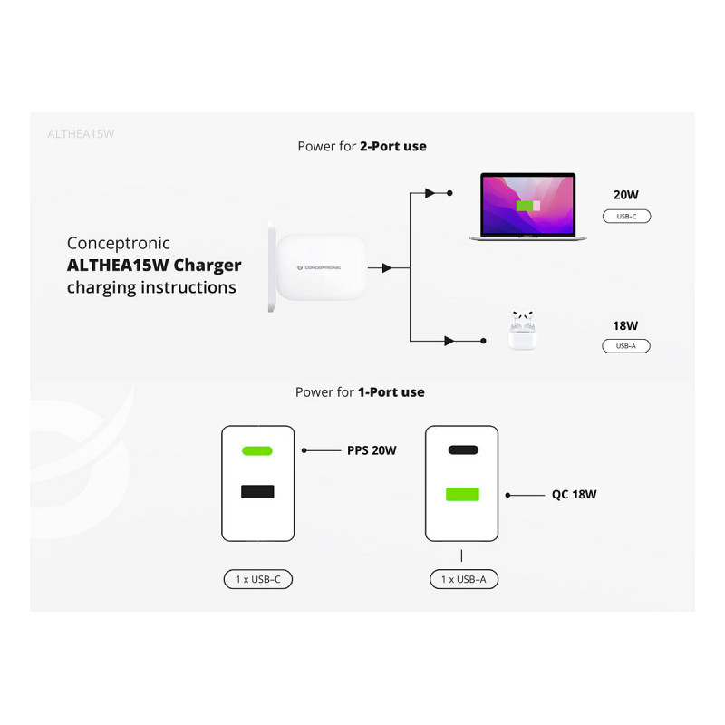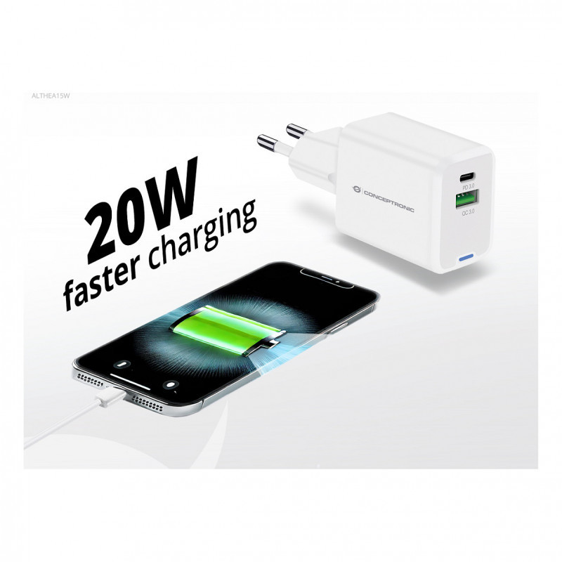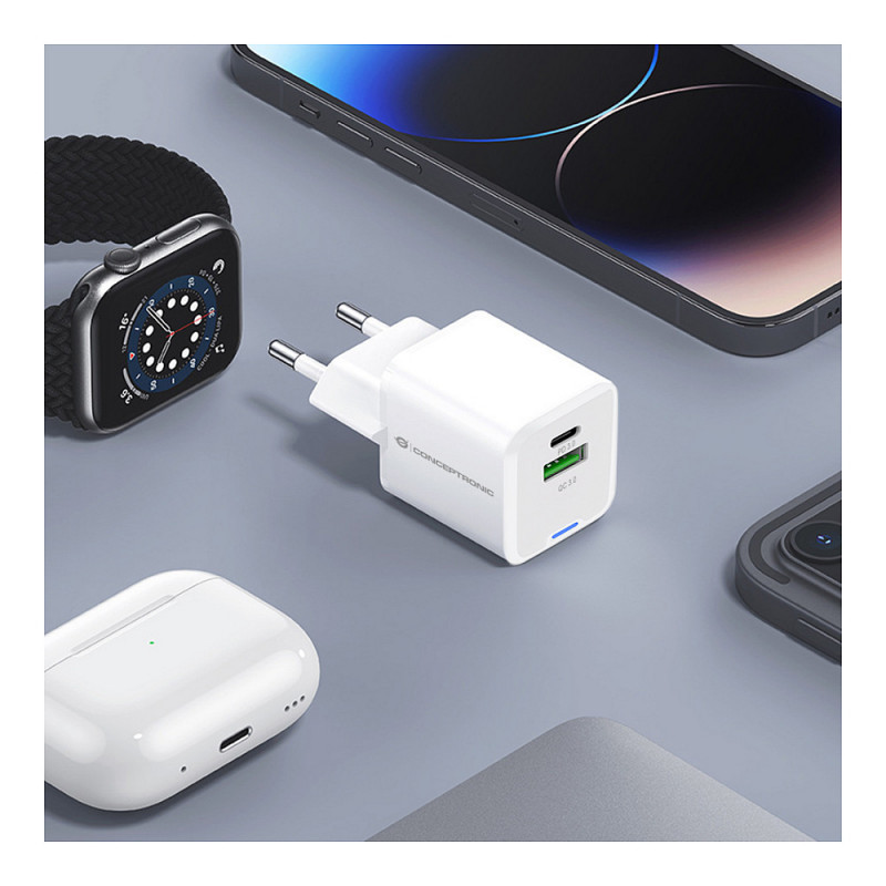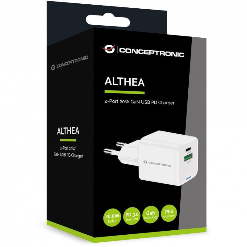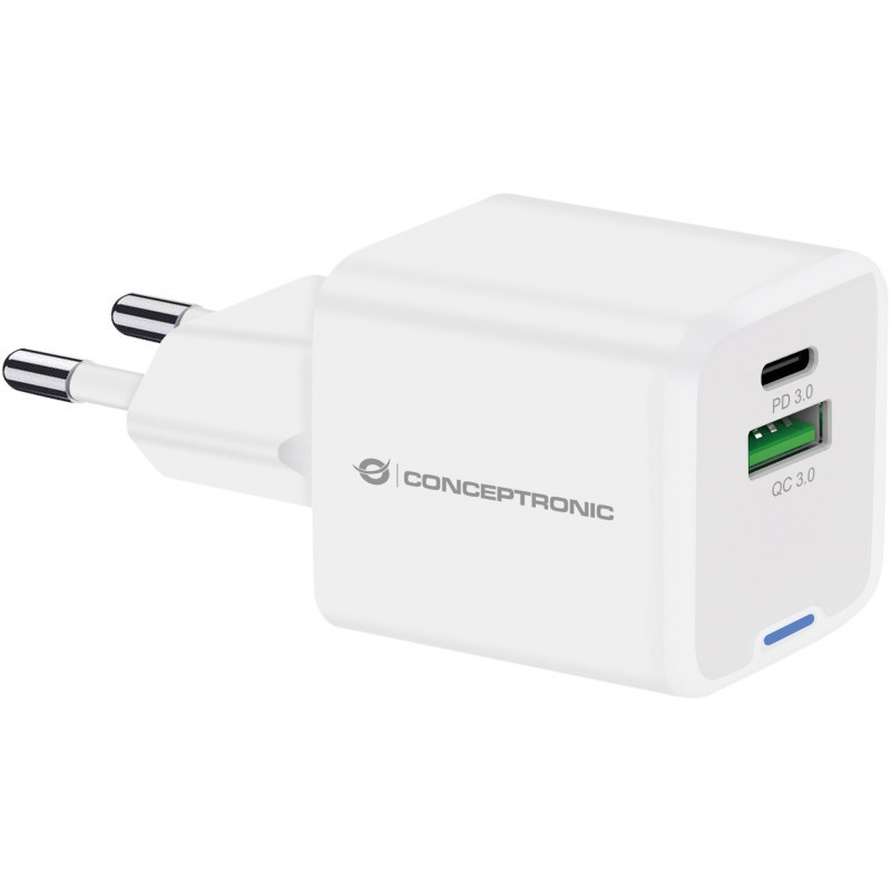 "Conceptronic 2-Port 20W GaN USB PD Charger, USB-C x 1, USB-A x 1, QC 3.0, PPS. Charger type: Indoor, Power source type: AC, Charger compatibility: Universal. Input voltage: 100 - 240 V, Maximum output voltage: 12 V. USB Type-C ports quantity: 1, Fast charging, Power protection features: Overheating, Overload, Short circuit. Product colour: White"\n"