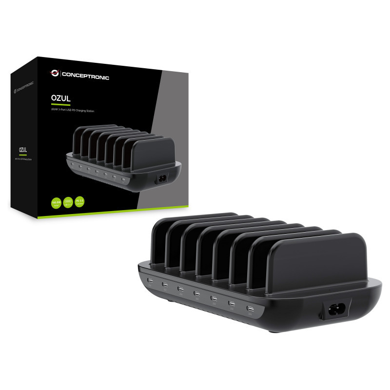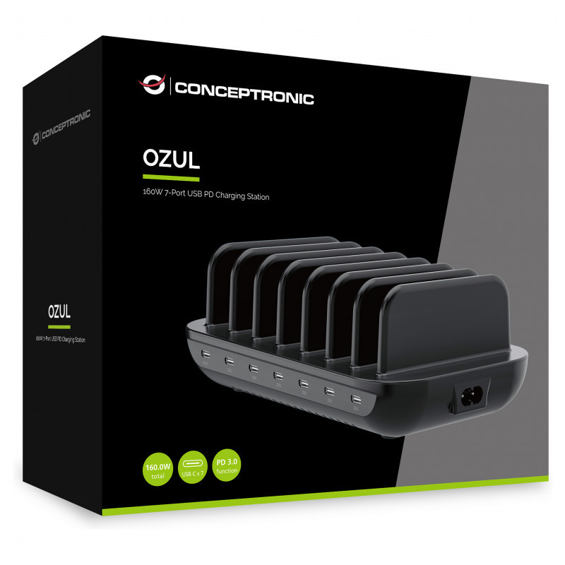 "Conceptronic OZUL07B 160W 7-Port USB PD Charging Station, USB-C x 7, PD 3.0. Charger type: Indoor, Power source type: AC, Charger compatibility: Universal. Input voltage: 100 - 240 V, Maximum output voltage: 20 V. USB Type-C ports quantity: 7, Fast charging, Power protection features: Over current, Over power, Short circuit. Product colour: Black"\n"Keep your devices powered and your workspace tidy with the 160W 7-Port USB PD Charging Station. Designed with separate compartments for each device, it helps reduce cable clutter while keeping everything organized and accessible.
