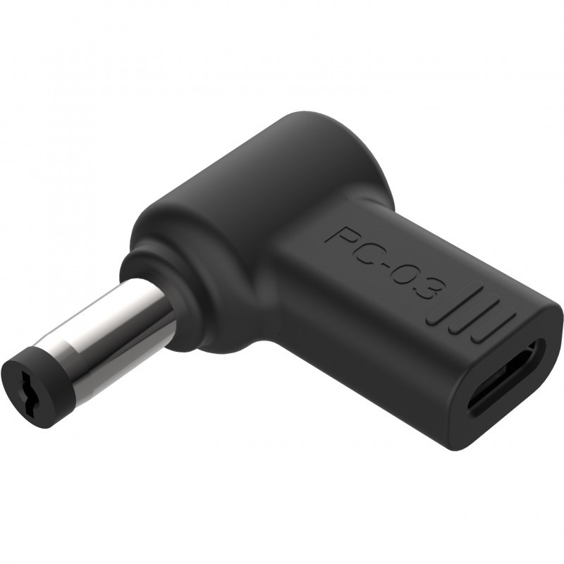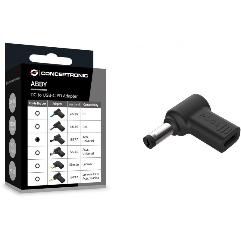 "Conceptronic ABBY15PC03 DC to USB-C Adapter, Acer/Universal 5.5x1.7mm, 18-20V. Product type: Laptop power tip, Product colour: Black, Brand compatibility: Acer. Input voltage: 18 - 20 V. Quantity per pack: 1 pc(s), Package width: 50 mm, Package depth: 25 mm. Width: 30 mm, Depth: 30 mm, Height: 6 mm. Pallet gross width: 120 cm, Pallet gross length: 80 cm, Pallet gross height: 152 cm"\n"This DC to USB-C adapter is designed for use with a USB-C PD charger, enabling connection to an Acer Laptop or other devices compatible with a 5.5x1.7mm DC connector."