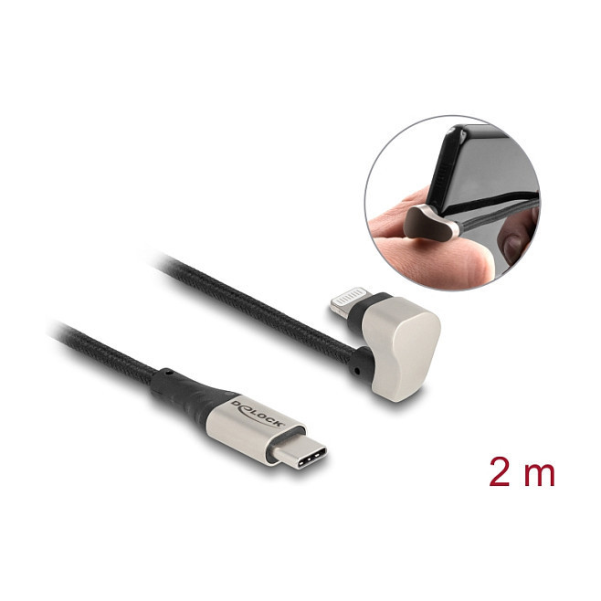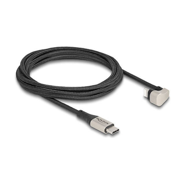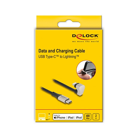 "DeLOCK Data and charging cable USB Type-C™ to Lightning™ for iPhone™ and iPad™ 180° angled 2 m MFi. Cable length: 2 m, Connector 1: Lightning, Connector 2: USB C. Output voltage: 9 V, Output current (max): 3 A. Cable diameter: 4 mm. Quantity per pack: 1 pc(s), Package type: Hanging box. Country of origin: China"\n"Description