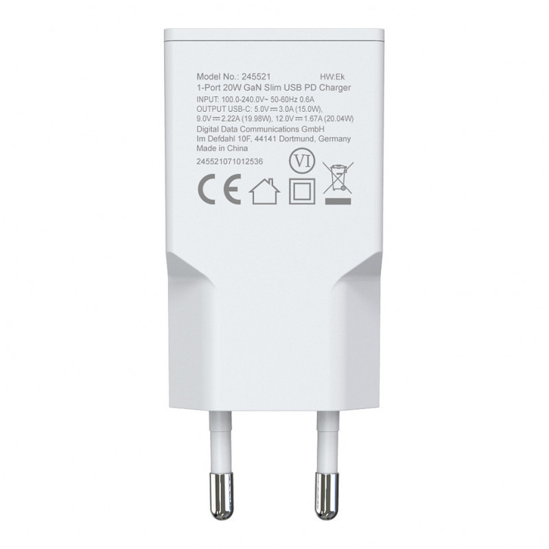 "Equip 1-Port 20W GaN Slim USB-C PD Charger. Charger type: Indoor, Power source type: AC, Charger compatibility: Universal. Input voltage: 100 - 240 V, Maximum output voltage: 12 V. USB Type-C ports quantity: 1, Fast charging, Power protection features: Over current, Over voltage, Overload, Short circuit. Product colour: White"\n"The Equip 245521 1-Port 20W GaN Slim USB-C PD Charger is a compact and efficient charging solution designed to meet the power needs of today’s mobile lifestyle. Built with advanced GaN (Gallium Nitride) technology, this charger delivers higher efficiency and reduced heat generation compared to traditional silicon chargers, enabling a slimmer and more portable design without compromising on performance.