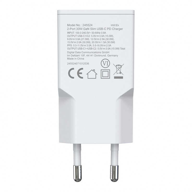 "Equip 2-Port 30W GaN Slim USB-C PD Charger. Charger type: Indoor, Power source type: AC, Charger compatibility: Universal. Input voltage: 100 - 240 V, Maximum output voltage: 20 V. USB Type-C ports quantity: 2, Fast charging, Power protection features: Over current, Over voltage, Overload, Short circuit. Product colour: White"\n"The Equip 245524 2-Port 30W GaN Slim USB-C PD Charger is a powerful yet compact charging solution tailored for modern lifestyles. Engineered with advanced GaN (Gallium Nitride) technology, it offers higher efficiency, faster charging, and less heat compared to traditional silicon-based chargers. This innovation allows for a slimmer and lighter form factor, making it exceptionally portable and convenient for use at home, in the office, or while traveling.