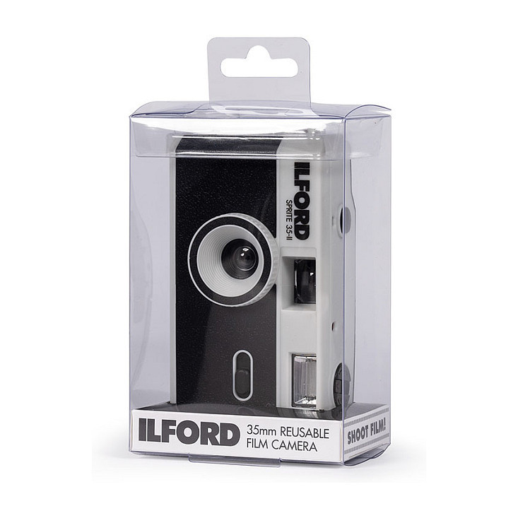 "Ilford Sprite 35 II. Camera type: Compact film camera, Film type: 35 mm, Film speed setting (ISO): 200 - 800. Lens diameter: 3.1 cm, Lens type: Wide-angle. Closest focusing distance: 1 m. Camera shutter type: Mechanical, Camera shutter speed: 120 s. Product colour: Black, Silver"\n"The Ilford Sprite 35-II a fun and affordable way to jump into analogue photography!