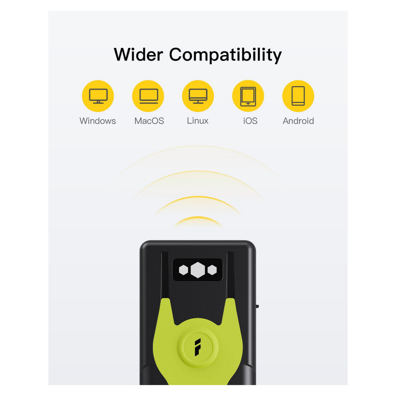 "Inateck BCST-42. Type: Handheld bar code reader, Scanner type: 2D, Sensor type: CMOS. Connectivity technology: Wired & Wireless, Standard interfaces: Bluetooth. Product colour: Black, Green, Grey, Housing material: Acrylonitrile butadiene styrene (ABS), Polycarbonate (PC), Thermoplastic urethane (TPU). Power source type: Battery, Battery capacity: 1200 mAh. Weight: 84 g, Width: 47 mm, Depth: 27 mm"\n"With the built-in Bluetooth 5.0 module, this Bluetooth scanner can be connected with your mobile phone, tablet and computer. It works with Android, iOS, Windows, Mac OS, Linux, Unix and Chrome OS.