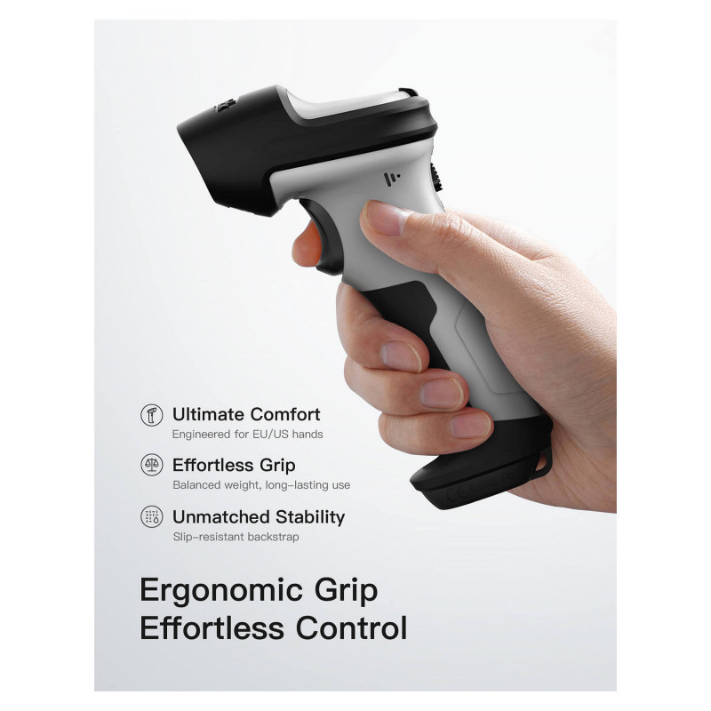 "Inateck BCST-72. Type: Handheld bar code reader, Scanner type: 2D, Sensor type: Laser. Connectivity technology: Wireless, Standard interfaces: Bluetooth, USB. Product colour: Black, Grey, Housing material: Polycarbonate (PC), Thermoplastic urethane (TPU), Protection features: Shockproof. Power source type: Battery, Battery capacity: 2600 mAh. Weight: 205 g, Width: 92 mm, Depth: 69 mm"\n"Advanced 2D Scanning Technology: Equipped with a high-performance 300,000-pixel 2D scanning module, this barcode scanner delivers lightning-fast and accurate recognition of nearly all 1D and 2D barcodes. Effortlessly scan damaged, wrinkled, or distorted barcodes in both strong and low-light conditions