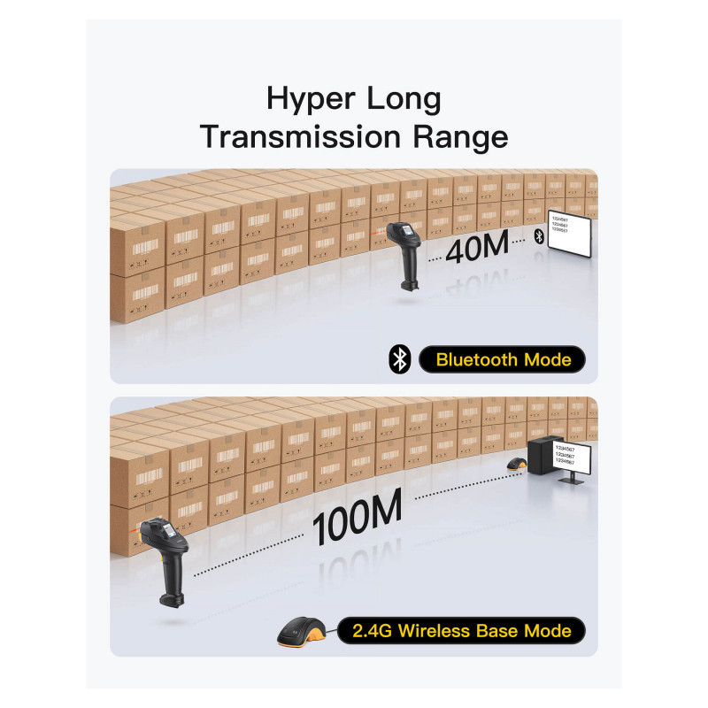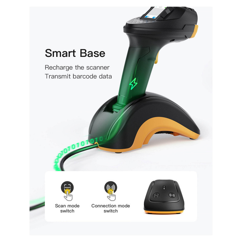 Smart Base, Longer Battery Life: Pro 8 is equipped with an arched charging base, which can serve as a wireless adapter to transmit data and also charge the barcode scanner to ensure uninterrupted work throughout the day. A full charge can last up to 2 days.