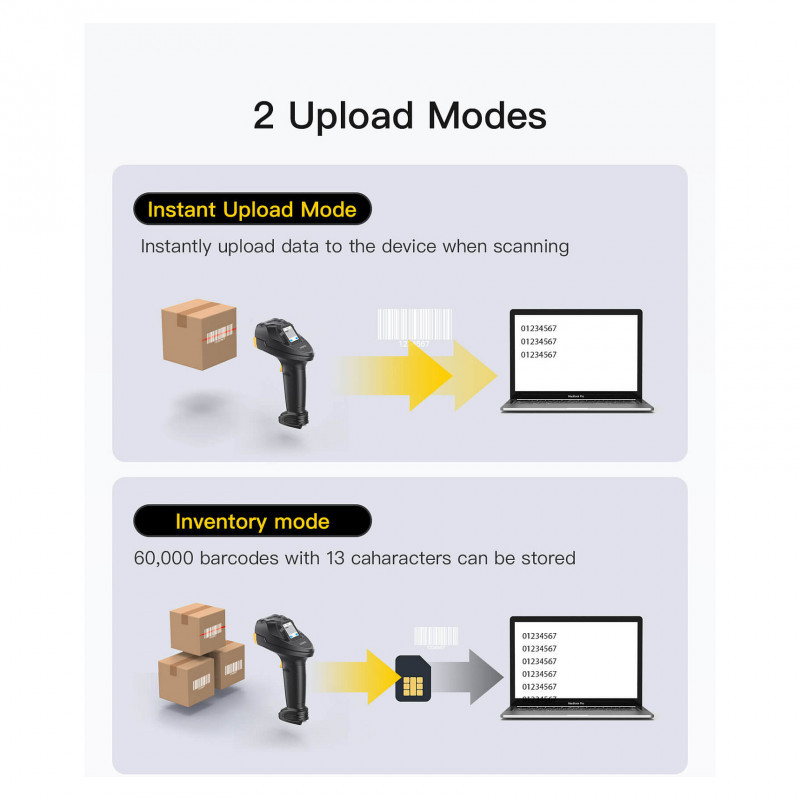 "Inateck PRO 8. Type: Handheld bar code reader, Scanner type: 1D/2D, Sensor type: CCD / CMOS. Connectivity technology: Wireless, Standard interfaces: Bluetooth, RF Wireless. Product colour: Yellow, Black, Housing material: Acrylonitrile butadiene styrene (ABS), Silicone, Display diagonal: 3.56 cm (1.4""). Power source type: Battery, Battery capacity: 2600 mAh, Battery life: 48 h. Weight: 700 g, Width: 75 mm, Depth: 100 mm"\n"Unique Touchscreen Design: A 1.4-inch touchscreen allows customization of language, volume, connection methods like a smartphone and real-time monitoring of scan status, battery level, time, barcode information, as well as barcode quantity. German and English interfaces are supported.
