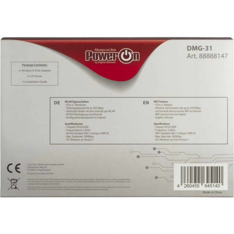 "Inter-Tech DMG-31. Internal. Connectivity technology: Wireless, Host interface: PCI Express, Interface: WLAN. Maximum data transfer rate: 300 Mbit/s, Top Wi-Fi standard: Wi-Fi 4 (802.11n), Wi-Fi band: Single-band (2.4 GHz)"\n"Wi-Fi 4 PCIe Adapter - 300 Mbps