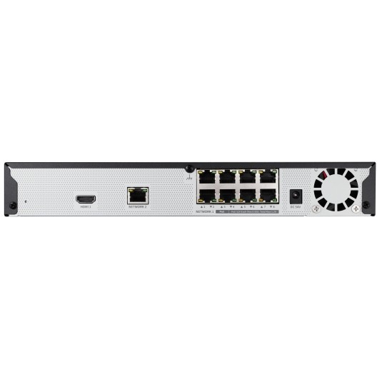"Hanwha QRN-830S. Video input channels: 8 channels, Maximum resolution: 3840 x 2160 pixels, Video codecs: H.265, H.264, MJPEG. Maximum storage capacity: 6 TB, HDD interface: SATA, SATA II, SATA III, Total installed storage capacity: 1 TB. Ethernet LAN data rates: 10,100 Mbit/s, Supported network protocols: IPv4, IPv6, TCP/IP, UDP/IP, RTP (UDP), RTP (TCP), RTSP, NTP, HTTP, DHCP (Server, Client), PPPoE,.... Product colour: Black. Output current: 1.2 A, Output voltage: 54 V, Total Power over Ethernet (PoE) budget: 35 W"\n
