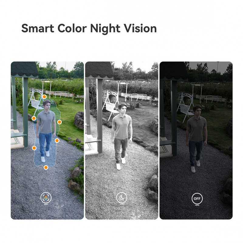 AOV Dual can be adjusted to different night vision modes to suit your needs and can automatically switch to full color mode when a person is detected to ensure a clear and bright picture; you can also turn off the night vision mode or apply only IR mode to reduce power consumption.
