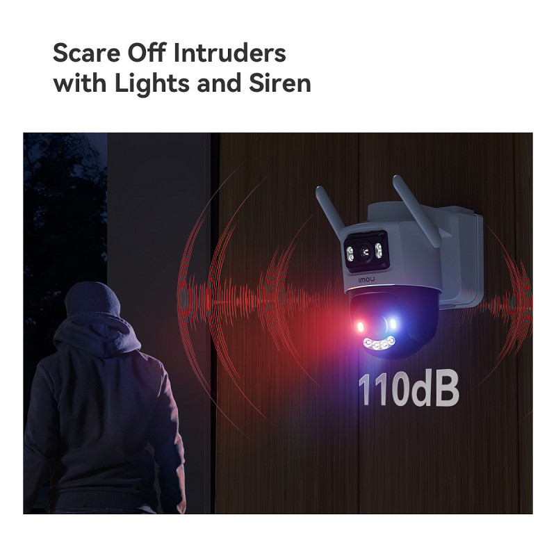 Scares off intruders with siren( up to 110dB ), spotlights, and red-blue lights.
