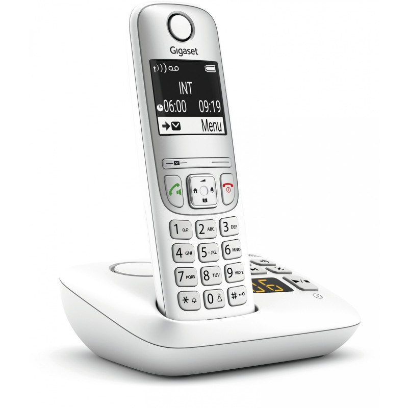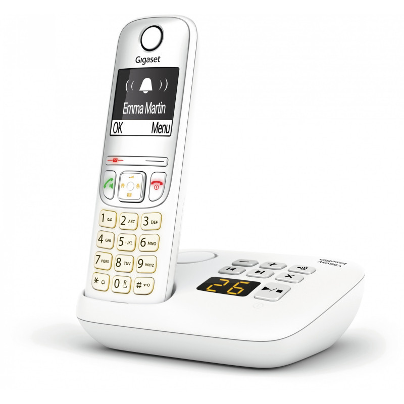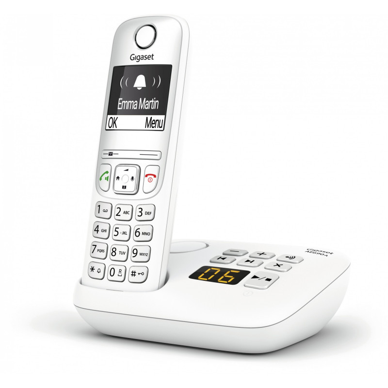 "Gigaset AE690A. Type: Analog/DECT telephone, Handset type: Wireless handset. Speakerphone. Maximum indoor range: 50 m, Maximum outdoor range: 300 m. Phonebook capacity: 100 entries. Caller ID. Display diagonal: 5.08 cm (2""). Product colour: White. Number of handsets included: 1"\n