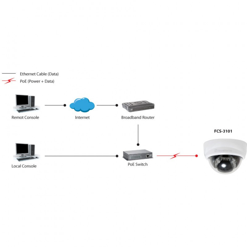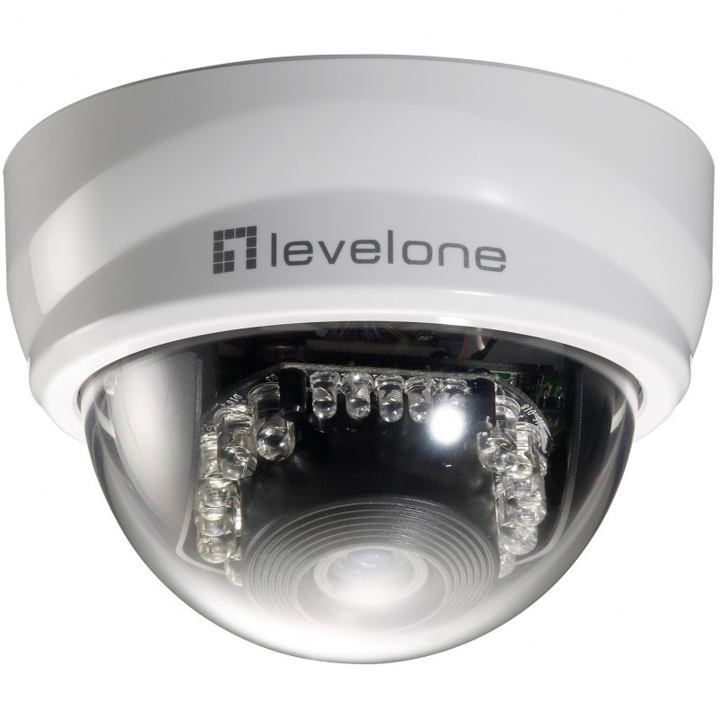 "LevelOne Fixed Dome IP Network Camera, 2-Megapixel, 802.3af PoE, IR LEDs. Type: IP security camera, Placement supported: Indoor & outdoor, Connectivity technology: Wired. Mounting type: Ceiling/Desk, Product colour: Black, White, Form factor: Dome. Minimum illumination: 1 lx, White balance: Auto, Camera shutter type: Electronic. Sensor type: CMOS, Optical sensor size: 25.4 / 2.7 mm (1 / 2.7""). Fixed focal length: 4 mm"\n"The LevelOne FCS-3101 is a palm-size and stylish design quality yet cost-effective surveillance solution for the home and office. It is designed for easy and flexible installation. Equipped with a 2-Megapixel sensor and built-in IR cut filter/IR illuminator LEDs, the camera provides high resolution quality and sharp sensitivity – ideal for security applications both day and night.