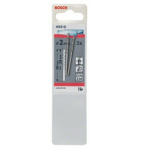 "Bosch Metal drill bit HSS-G, DIN 338. Proper use: Drill, Drill bit type: Twist drill bit, Drill bit diameter: 2 mm. Number of drill bits: 1 pc(s)"\n"- Suitable for alloyed and non-alloyed steel up to a tensile strength of 900 N/mm², cast steel, cast iron, sintered iron, malleable cast iron, non-ferrous metals, hard plastics