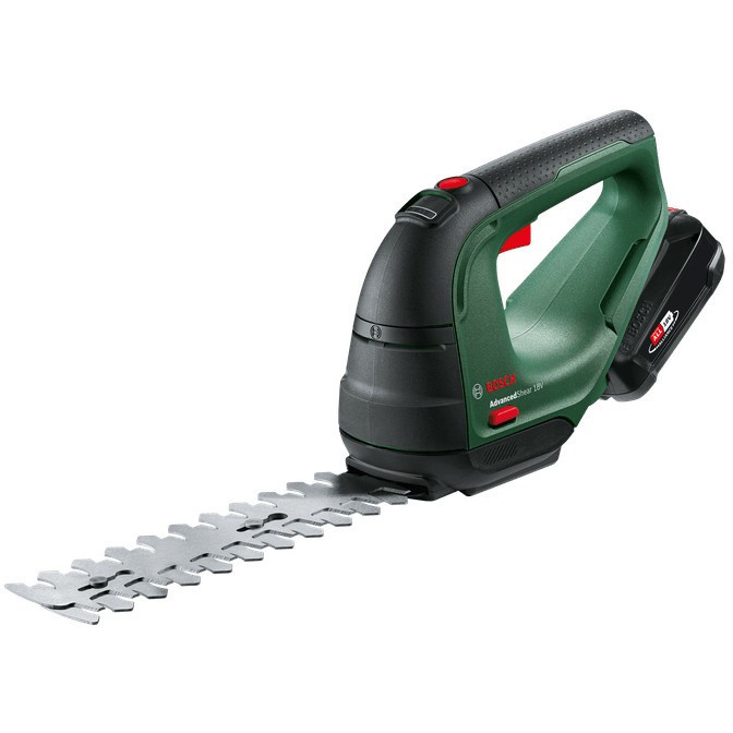 "Bosch AdvancedShear 18V-10. Blade width: 10 cm, Shrub blade tooth spacing: 8 mm, Product colour: Black, Green. Battery voltage: 18 V, Battery technology: Lithium-Ion (Li-Ion), Charging time: 2 h. Width: 105 mm, Depth: 462 mm, Height: 163 mm"\n"Superior performance and manoeuvrability for effortless shaping and trimming