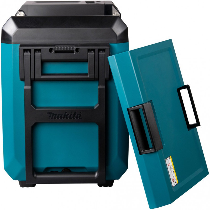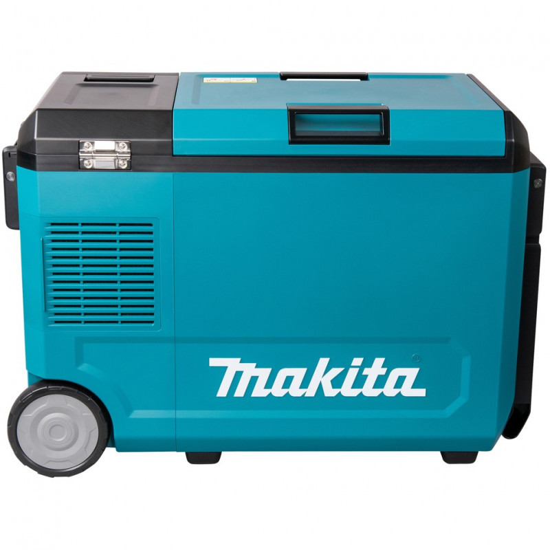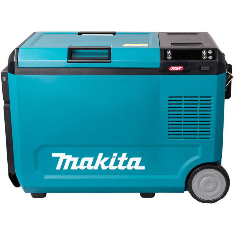 "Makita CW004GZ. Product colour: Black, Blue, Display: LED, Number of wheels: 2 wheel(s). Capacity: 29 L, Cooling temperature range: -18 - 60 °C, International Protection (IP) code: IPX4. Power source: Electric, Power source type: AC, Battery, DC, AC input voltage: 100 - 240 V. Width: 345 mm, Depth: 676 mm, Height: 471 mm. Cables included: Cable for cigarette lighter"\n