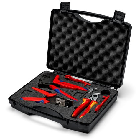KNIPEX Werkzeugkoffer für Photovoltaik MC4 – tai profesionalus įrankių rinkinys, skirtas darbui su MC4 tipo saulės jungtimis. Šis lagaminas idealiai tinka saulės elektrinių montuotojams ir technikams.