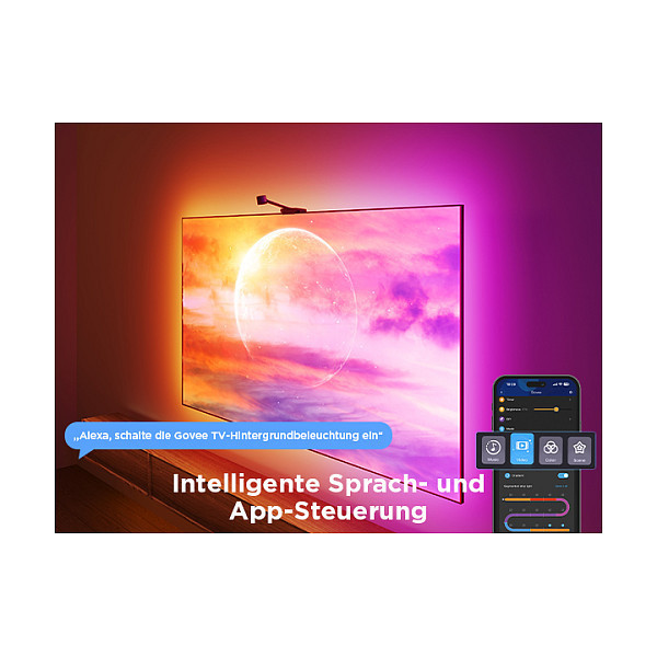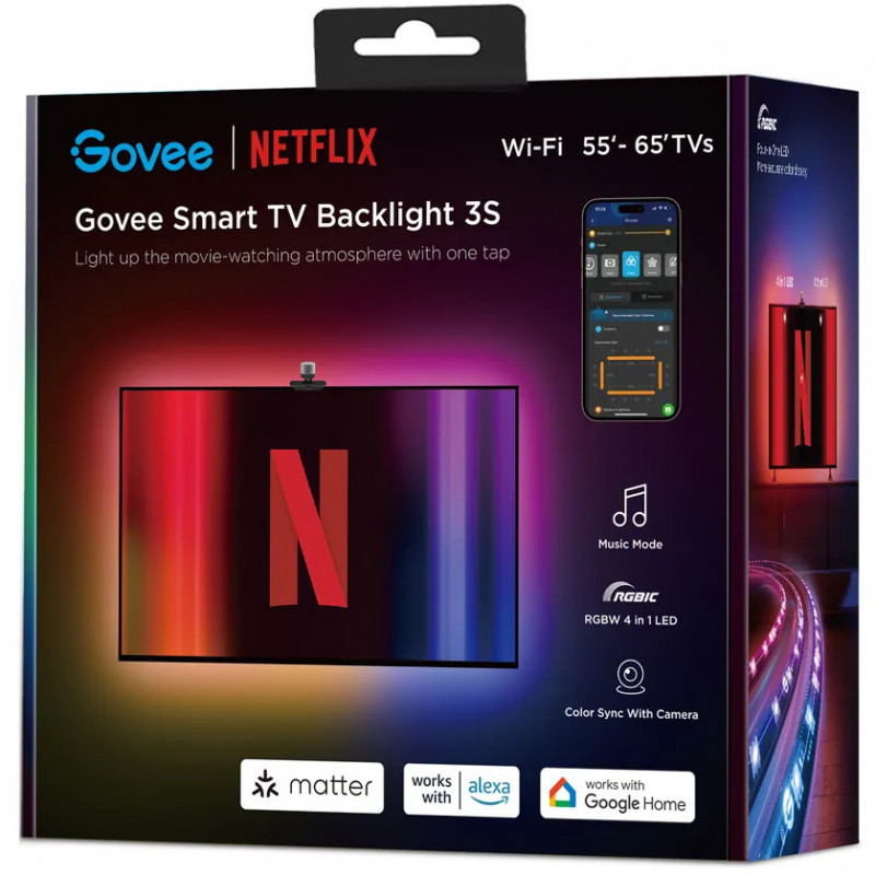 "Govee H6098. Type: Smart strip light, Interface: Wi-Fi/Bluetooth, Product colour: Black. Energy efficiency class: G, Energy consumption per 1000 hours: 2 kWh, Energy efficiency scale: A to G. Package type: Hanging box. Quantity per pack: 1 pc(s)"\n"With the Govee H6098 Envisual TV Backlight, your movie experience will become more immersive than ever before. Immerse yourself in a dynamic play of lights that automatically adjust to what is being projected on your TV, creating a unique atmosphere in your living room.