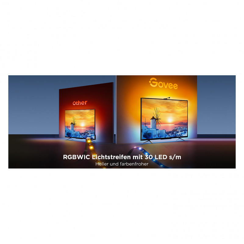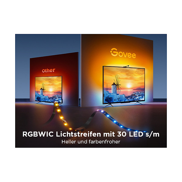 The Govee H6098 stands out brightness of 30 LED/m, which ensures intense light and vivid colours. Compared to traditional LED strips, RGBWIC offers even greater colour accuracy. Your home cinema will take on a new glow with deep colours and dynamic light transitions.