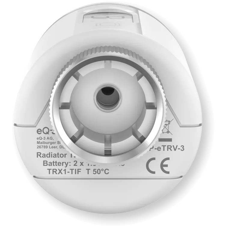 "Homematic IP HmIP-eTRV-3. Type: Digital thermostat, Proper use: Room, Interface: RF. Display: E Ink. Power source: Battery, Battery type: AA, Battery voltage: 1.5 V. Width: 56.5 mm, Depth: 95 mm, Height: 56.5 mm. Compliance certificates: CE"\n"Intelligent heating in an unpretentious design with the energy-saving e-paper display cuts your heating costs by up to 33%.