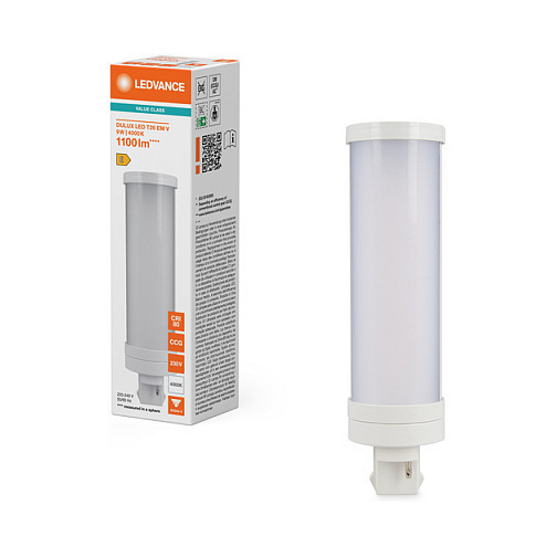 "Osram DULUX LED T EM & AC MAINS VALUE. Bulb power: 9 W, Equivalent bulb power: 26 W, Luminous flux: 1100 lm, Bulb lifetime: 30000 h, Light colour: Cool white, Colour temperature: 4000 K, Beam angle (max): 120°, Color Rendering Index (CRI): 80, Power factor: 0.9"\n