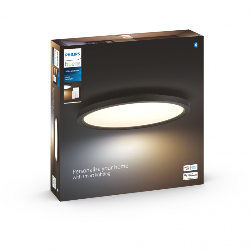 "Philips Hue White ambience Aurelle Round Panel. Type: Smart ceiling light, Interface: Bluetooth, Product colour: Black. Power source type: AC, Input voltage: 220–240 , Bulb voltage: LED. Width: 395 mm, Depth: 395 mm, Height: 47 mm. Package width: 104 mm, Package depth: 454 mm, Package height: 453 mm. Quantity per pack: 1 pc(s)"\n"Easy smart lighting