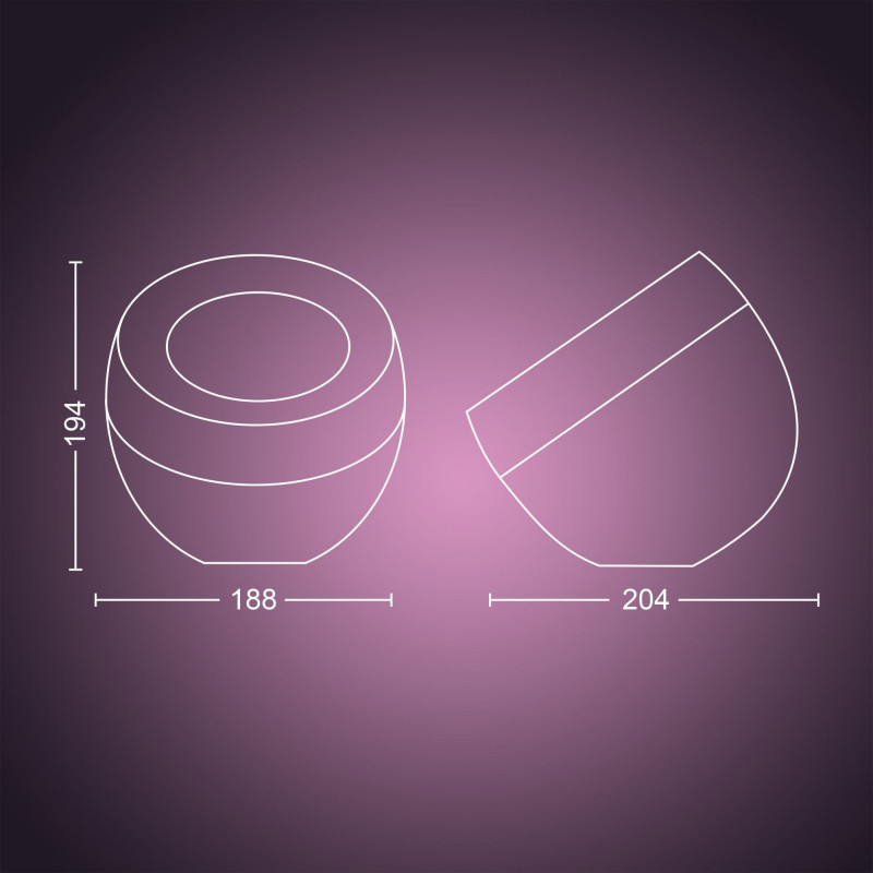 "Philips Hue White and colour ambience Iris table lamp. Type: Smart table lamp, Interface: Bluetooth/Zigbee, Product colour: Black. Mobile operating systems supported: Android 10.0, iOS 15. Energy efficiency class: G, Energy consumption per 1000 hours: 8.1 kWh, Input voltage: Напруга 100 В – 240 В. Cable length: 2 m, Width: 188 mm, Depth: 204 mm. Package type: Box, Package width: 218 mm, Package depth: 245 mm"\n"Easy smart lighting
