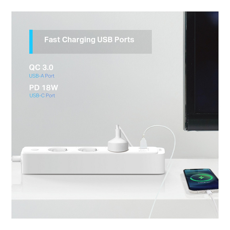 "TP-Link Tapo P300. AC outlets quantity: 3 AC outlet(s), Power plug type: Type F (CEE 7/4), Cable length: 1.5 m. Maximum input power: 2300 W, AC input voltage: 220 - 240 V, AC input frequency: 50 - 60 Hz. Wi-Fi standards: 802.11b, 802.11g, Wi-Fi 4 (802.11n), USB port type: USB Type A/USB Type-C. Width: 55 mm, Depth: 40 mm, Height: 268 mm. Quantity per pack: 1 pc(s)"\n"Power all your devices.