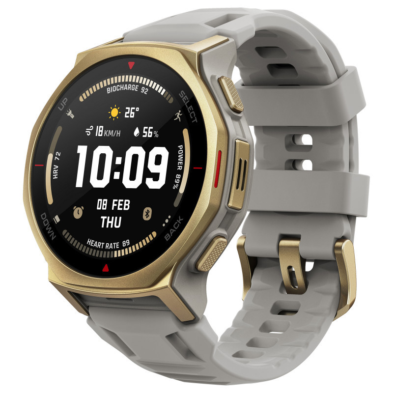 "Amazfit T-rex 3 Pro. Display diagonal: 3.35 cm (1.32""), Display technology: AMOLED, Display resolution: 466 x 466 pixels, Touchscreen. RAM capacity: 64 MB, Flash memory: 16 GB. Wi-Fi. GPS (satellite). Battery capacity: 640 mAh. Weight: 46.8 g. Waterproof up to: 45 m, Band material: Silicone, Band colour: Grey"\n