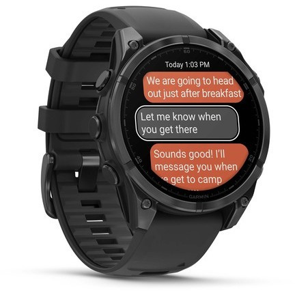 "Garmin Fenix 8. Display diagonal: 3.56 cm (1.4""), Display technology: AMOLED, Display resolution: 454 x 454 pixels, Touchscreen. Flash memory: 32 GB. Wi-Fi. GPS (satellite). Waterproof up to: 40 m, Band material: Silicone, Band colour: Black, Band size: One Size"\n"For serious athletes and adventurers who want to push beyond their limits, this premium sports GPS smartwatch is built to perform and styled for larger wrists with advanced strength training features, dive capability, an internal speaker and mic for voice features, a built-in LED flashlight and more."