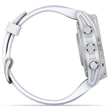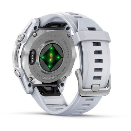 "Garmin Fenix 8. Display diagonal: 3.3 cm (1.3""), Display technology: AMOLED, Display resolution: 416 x 416 pixels, Touchscreen. Flash memory: 32 GB. Wi-Fi. GPS (satellite). Waterproof up to: 40 m, Band material: Silicone, Band colour: White, Band size: One Size"\n"For serious athletes and adventurers who want to push beyond their limits, this premium sports GPS smartwatch is built to perform and styled for larger wrists - with advanced strength training features, dive capability, an internal speaker and mic for voice features, a built-in LED flashlight and more."