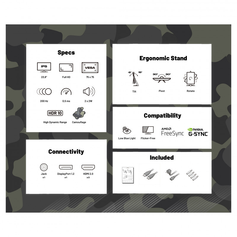 "JAPANNEXT JN-IPS238FHD200F-HSP-CAMO. Display diagonal: 61 cm (24""), Display resolution: 1920 x 1080 pixels, HD type: Full HD, Display technology: LCD, Display surface: Matt, Response time: 0.5 ms, Native aspect ratio: 16:9, Viewing angle, horizontal: 178°, Viewing angle, vertical: 178°. Built-in speaker(s). VESA mounting, Height adjustment. Product colour: Black"\n