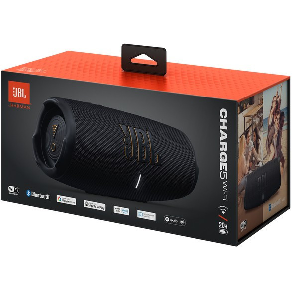 "JBL Charge 5 Wi-Fi. RMS rated power: 40 W, Woofer RMS power: 30 W, Tweeter RMS power: 10 W. Connectivity technology: Wireless, Frequency range: 2.4 - 2.4835 GHz, Bluetooth transmitter modulation: 8DPSK, DQPSK, GFSK. Product type: Stereo portable speaker, Product colour: Black, Product design: Tube. Recommended usage: Mobile phone / Smartphone. Battery type: Built-in battery, USB Type-C required charging power (min): 7.5 W, USB Type-C required charging power (max): 15 W"\n"Bold JBL Original Pro Sound with deep bass