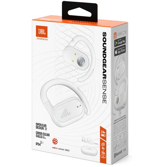"JBL Soundgear Sense. Product type: Headset. Connectivity technology: True Wireless Stereo (TWS), Bluetooth. Recommended usage: Calls/Music. Headphone frequency: 20 - 20000 Hz. Product colour: White"\n"JBL OpenSound Technology